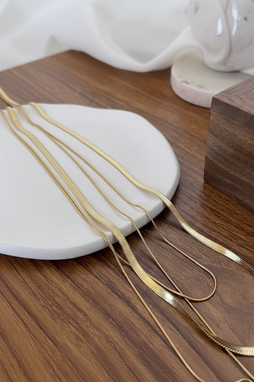 Elevate your necklace game with this sophisticated triple layer snake design that combines delicate chains at varying lengths for dimensional depth and refined elegance.